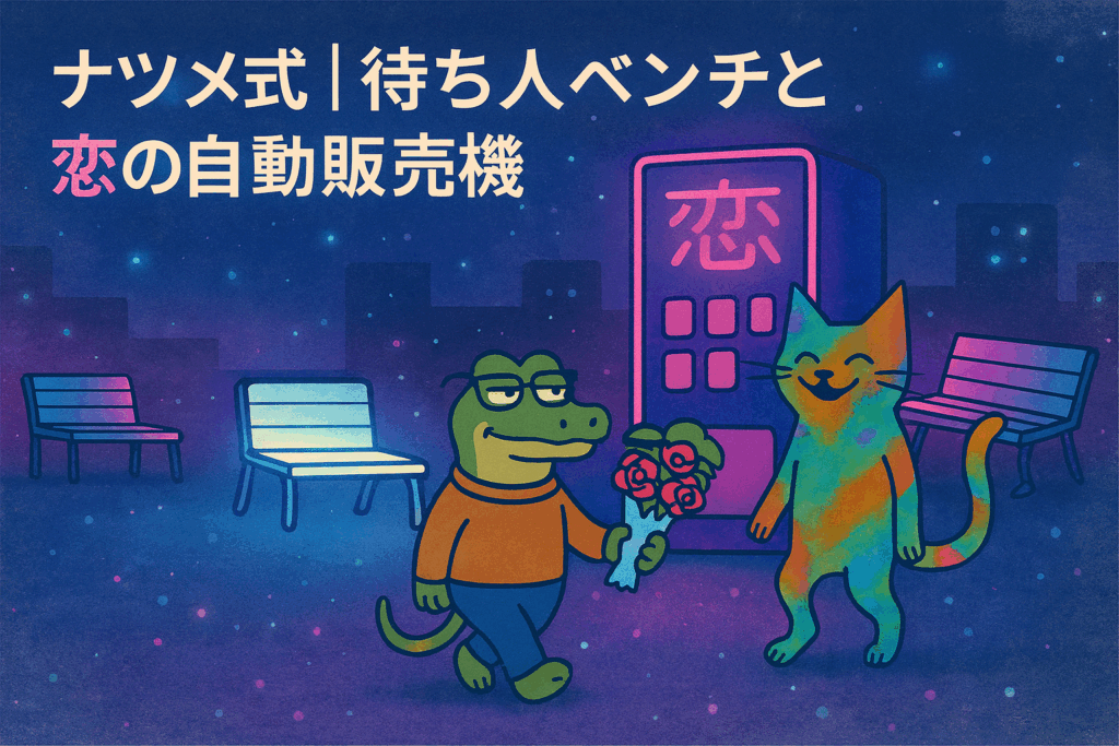 夜の街に並ぶ“待ち人ベンチ”と“恋の自動販売機”。 受け身の恋を座り続けた人々、そして歩き出す虹色の猫・ナツメ。 「動かない心は、愛されない」──不条理でやさしい恋の寓話。 -