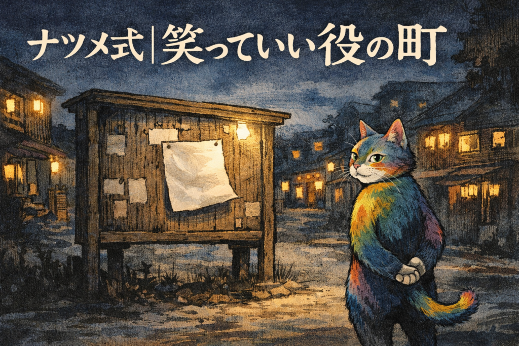 誰かを笑っていい存在にすることで成り立つ町。安心のために用意された「役」は、やがて人を人でなくしていく。虹色の猫ナツメが案内する、不条理で静かな寓話。 -