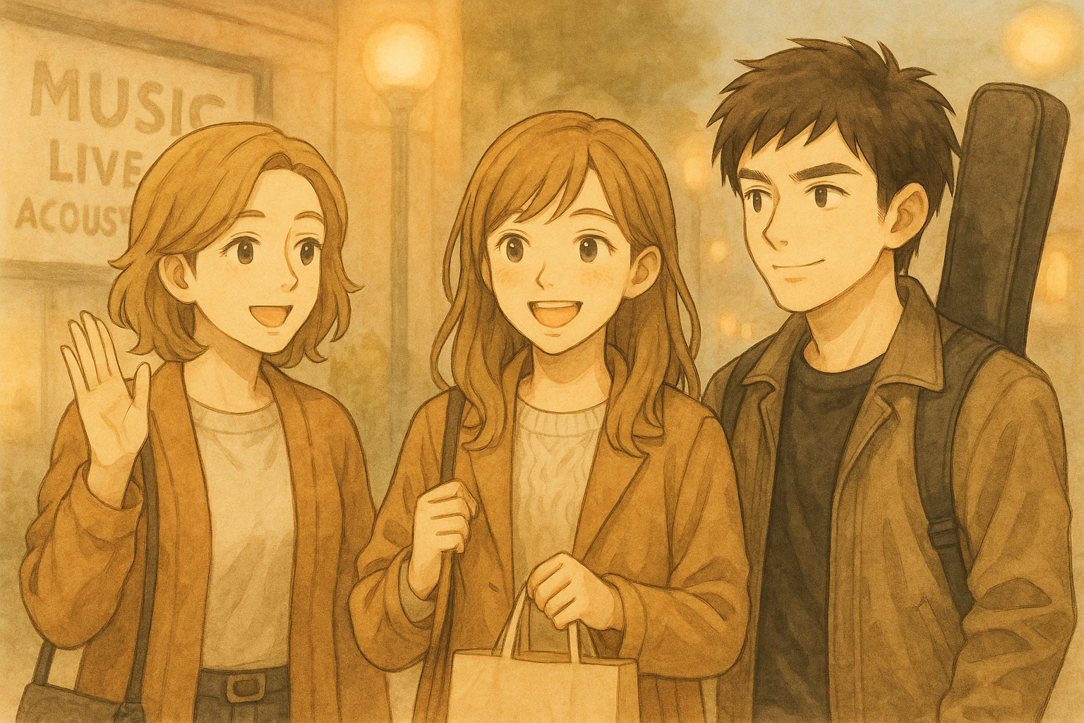 ケンジとマリは、ふたりに軽く手を振って店へ入っていく。 扉の隙間から、ほんのりジャズが流れ出た。