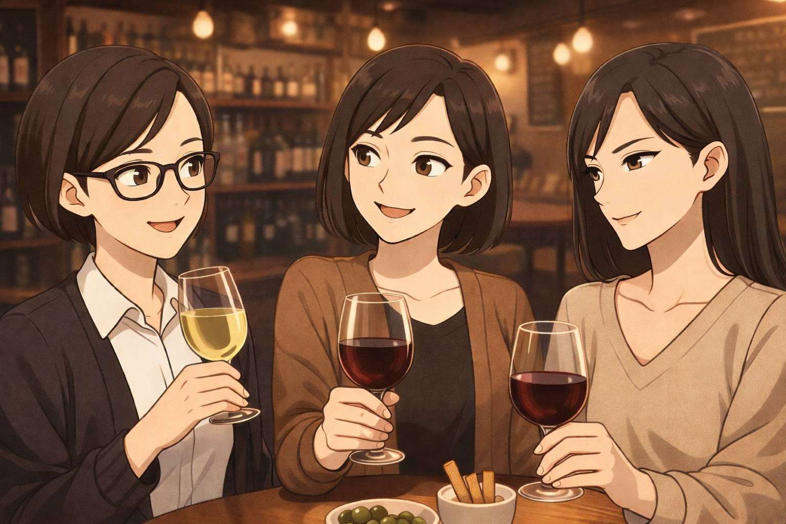 ワインを一口飲んで、ユキノが少しだけグラスを回す。さっきまで軽かった空気に、ほんの少しだけ現実味が混ざる。