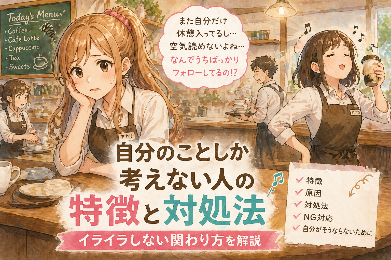 ミカコ:まずは整理からいこうか。“自分のことしか考えない人”って、どういう行動が多いのか。