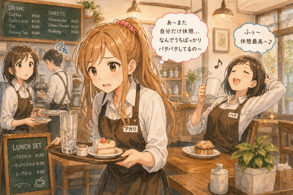 忙しくても平気で自分だけ休憩入るし、ミスしても「え、うちじゃないし」みたいな顔するし。
