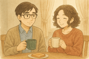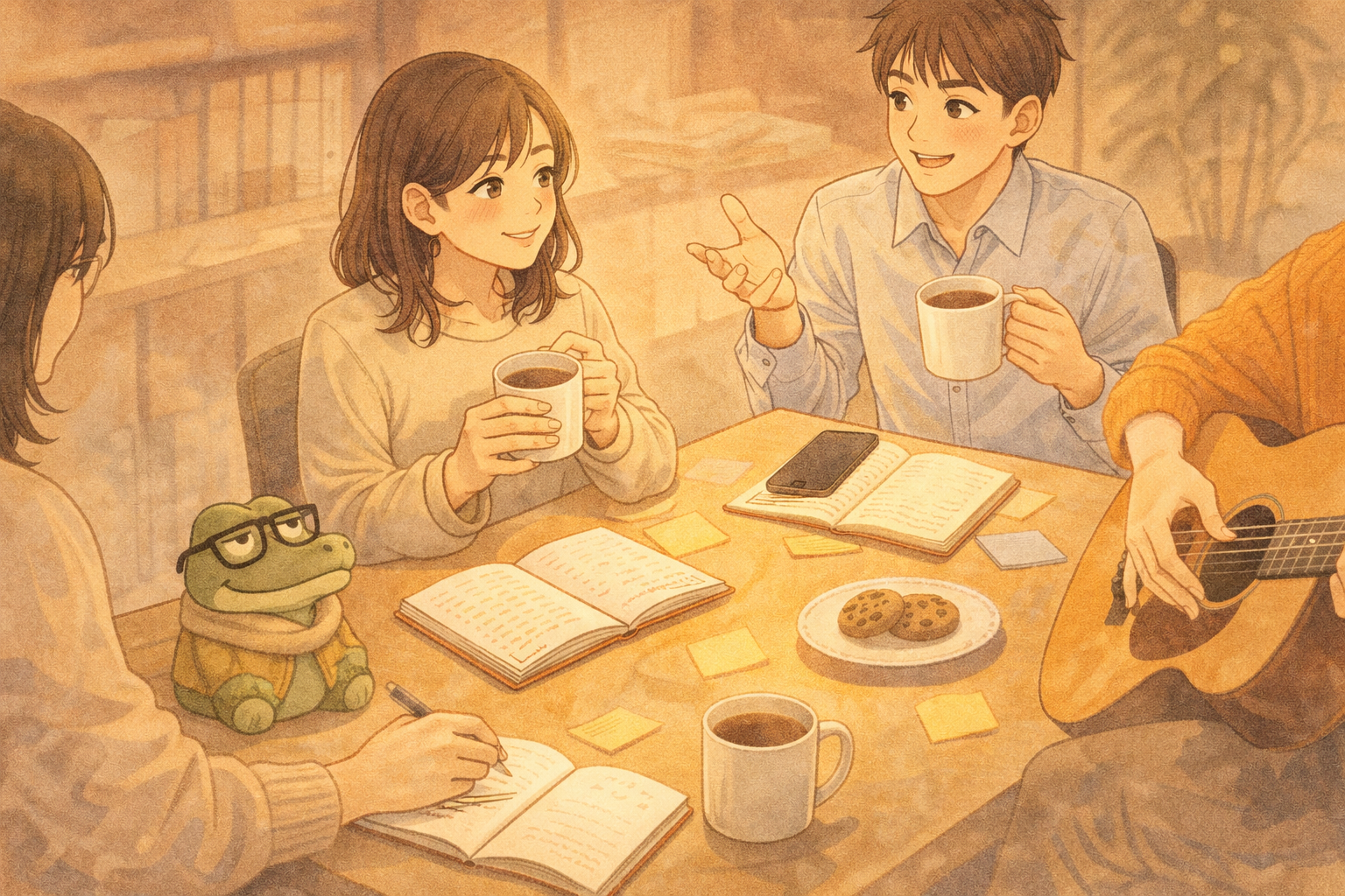 いつもの机に飲み物とお菓子が並び、みんながゆるく集まっている。