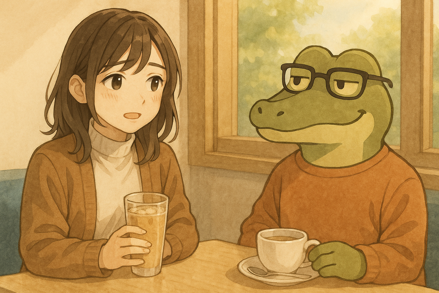 午後のカフェテラス。 ミユはアイスラテを両手で抱えながら、ワニオの隣に腰をおろした。 ワニオ専用の「防水ベンチ」は今日も健在だ。 すっかり常連扱いのワニオに、店員さんも「いつもありがとうございます」と微笑んでいる。