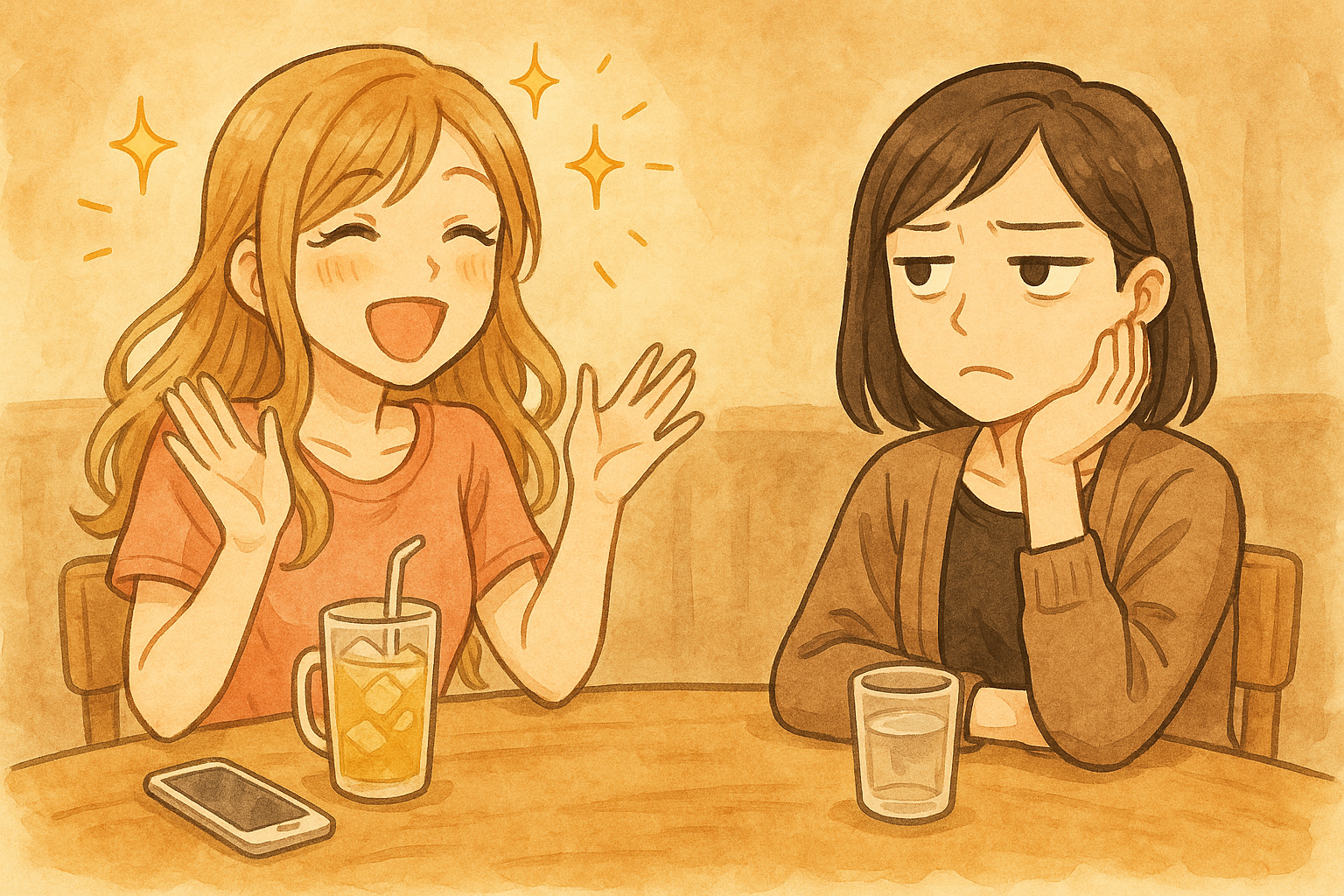 ミサキ:あえて言うけど、どうしても耐えられないなら距離を取るのも戦略よ。会う頻度を減らすとか、グループで会うようにするとかね。惚気で消耗するくらいなら、自分の心を守る方が大事。友情は「距離感」で続くものだから。