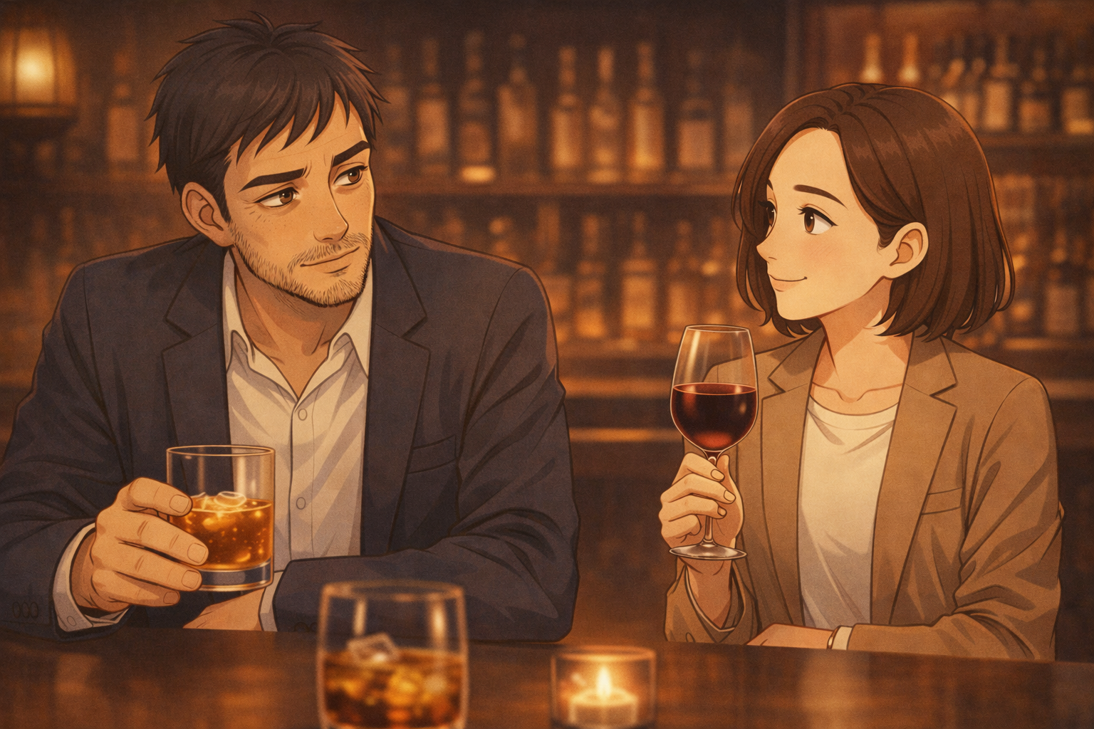 カウンター越しに、柔らかい灯りがグラスを照らしている。