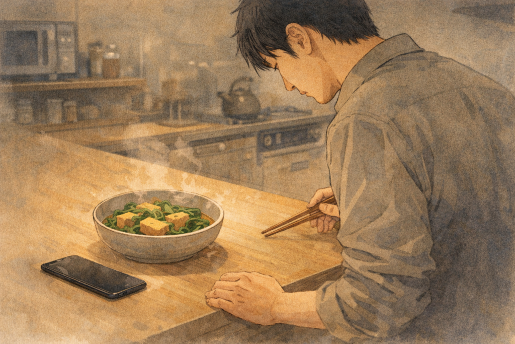 編集部で元カノ・ミサキと会話した夜、ふと見返した過去のLINEに赤面するリク。甘すぎる言葉を否定せず、今の自分の温度に戻るために作ったのは「甘くしないだし巻き卵」。リクの誠実めし第3話。 -