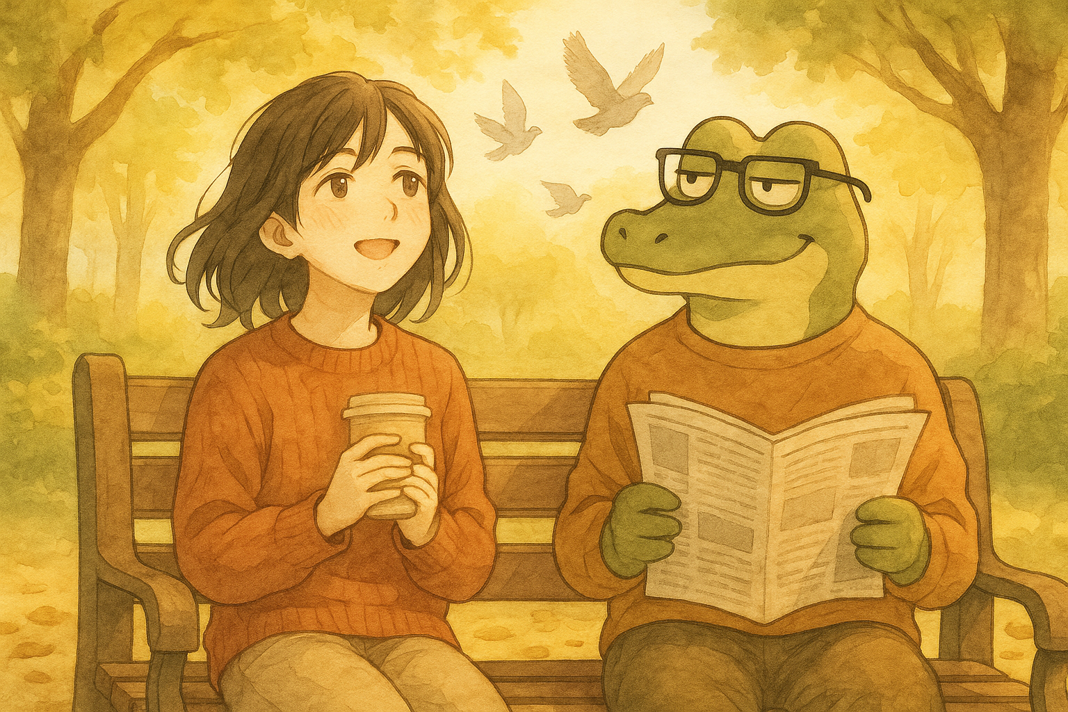 淡い日差しの中、 サングラスをかけたワニが、 新聞を広げて静かに日光を浴びている。