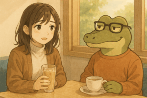 カフェのBGMに混じって、二人の会話はゆるやかに続く。 恋をしないワニと、恋に生きる女子。 そんな奇妙な組み合わせが、この午後いちばんのエンタメになっていた。